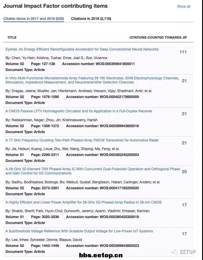 Below we will analyze the relevant data of JSSC in detail. Figure 2 shows the specific calculation formula for the JSSC impact factor in 2018. It refers to the number of JSSC papers cited in 2017 and 2016 (2716) divided by the total number of papers published in 2017 and 2016 (525) throughout 2018.